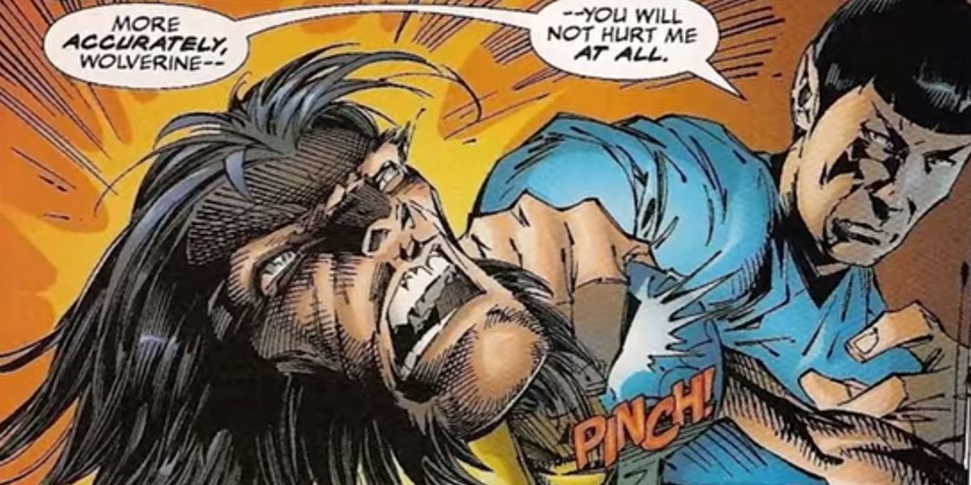 Wolverine doesn't seem to know how to behave when he's crossing into other universes either. In Star Trek/X-Men written by Scott Lobdell, the X-Men chase Proteus through a dimensional rift and find themselves fighting alongside the Enterprise. The X-Men manage to transport onto the Enterprise where they try to sneak Gambit into the sick bay. Spock detects them on board and is attacked by Wolverine, which isn't the best way to introduce yourself. Embarrassingly for Wolverine, Spock knows who he is and easily puts him down with a nerve pinch.